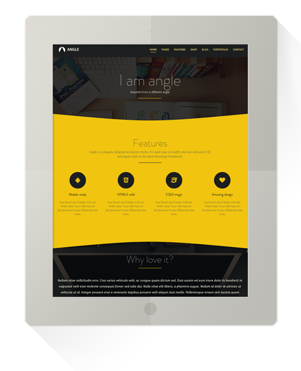 Angle is a uniquely designed wordpress theme. It's super easy to modify and uses advanced CSS techniques built on the latest Bootstrap Framework.